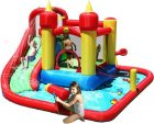Батут выполнен в виде большой изогнутой горки, попасть на которую можно по стене со специальными отверстиями для ног. С помощью водяной пушки дети могут поливать водой своих друзей, которые в этот момент скатываются по горке. Ну а спрятаться от освежающих брызг можно в отдельной комнатке для прыжков и игр.