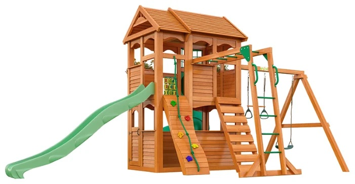 Детская площадка для дачи включает в себя целый игровой комплекс, в который входит: закрытый двухуровневый домик (с деревянной крышей и дверью), рукоход, скалодром, два вида горок (волновая и горка-труба), доска для игры в “Крестики-нолики”, разнообразные качели, канат и многие другие комплектующие элементы. Маленькие альпинисты оценят надежность скалодрома и страховочных канатов. Комплекс достаточно прочный, безопасный и экологичный. В нем вы не найдете острых углов, а крепления настолько надежные, что можете не волноваться о безопасности своего ребенка во время игры.