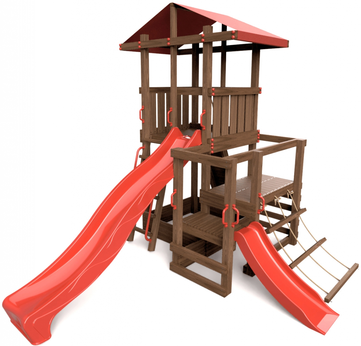 Конструкция представляет собой игровой домик с лесенкой, песочницей, пластиковым скатом, установленным на высоту 150 см, а также пристройкой со скатом на высоте 60 см, и веревочной лесенкой.