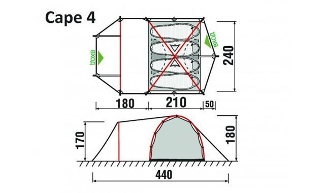 Green Land Cape 4 комфортная четырехместная палатка для кемпинга или автотуризма. Один из тамбуров увеличенного размера, высота позволяет встать в полный рост.