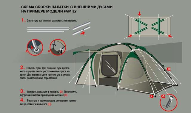 От формы палатки зависят её некоторые свойства. В продаже можно встретить следующие конструкции: полусфера, полубочка, двускатная, шатровая, а также встречаются и нестандартные модели.