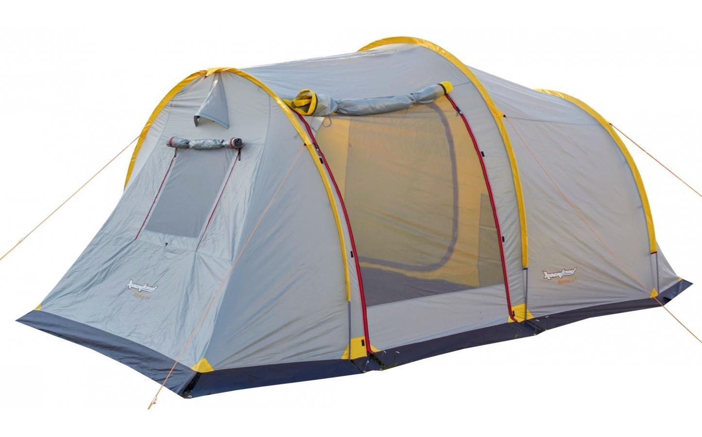 RockLand Nomad 4+1 кемпинговая палатка ангарного типа c двумя входами и одним большим тамбуром. Москитная сетка на входе в тамбур, на входе во внутреннюю палатку и на вентиляционных окнах. Съемный пол в тамбуре. Для защиты от солнца и дождя можно установить козырек перед вхдом. Палатка оборудована большим количеством карманов. При желании возможна установка и без внутренней палатки.В комплект поставки входит установочный комплект: каркас, колышки и растяжки.