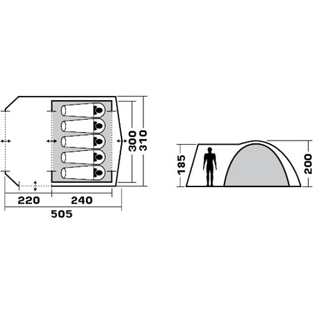 Двухслойная кемпинговая палатка Atlanta Air 5 имеет отличную вентиляцию благодаря двум входам в палатку с противоположных сторон. В просторном высоком и светлом тамбуре со съемным полом и двумя входами вы разместите все необходимые вещи и кемпинговую мебель. Дверь тамбура можно использовать как откидной козырек.