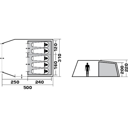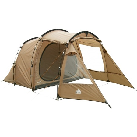 Назначение: кемпинговая • Количество мест: 5 • Форма: полубочка • Материал тента: полиэстер • Каркас: внешний • Количество входов: 2 • Количество комнат: 2 • Внутренняя палатка: есть • Навес: есть • Вентиляционные окна: есть • Окна: есть • Материал внутренней палатки: полиэстер • Материал дна: полиэтилен • Материал дуг: стеклопластик • Водостойкость тента: 3000 мм вод. ст. • Водостойкость дна: 10000 мм вод. ст.