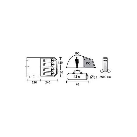 Назначение: кемпинговая • Количество мест: 4 • Форма: нестандартная • Материал тента: полиэстер • Вес: 12 кг • Каркас: внешний • Количество входов: 2 • Количество комнат: 1 • Внутренняя палатка: есть • Навес: есть • Вентиляционные окна: есть • Окна: есть • Материал внутренней палатки: полиэстер • Материал дна: полиэтилен • Материал дуг: стеклопластик • Герметизация швов: проклеенные • Ветро- сенгозащита: нет
