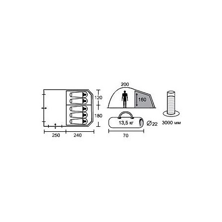 Назначение: кемпинговая • Количество мест: 5 • Форма: нестандартная • Материал тента: полиэстер • Вес: 13.5 кг • Каркас: внешний • Количество входов: 2 • Количество комнат: 1 • Внутренняя палатка: есть • Навес: есть • Вентиляционные окна: есть • Окна: есть • Материал внутренней палатки: полиэстер • Материал дна: полиэтилен • Материал дуг: стеклопластик • Герметизация швов: проклеенные • Ветро- сенгозащита: нет