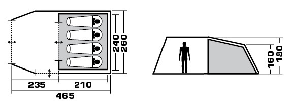 Палатка имеет очень большой, высокий -190 см, и светлый тамбур с дополнительным боковым входом, где с лёгкостью можно поставить стол и 4 стула или организовать небольшую кухню во время непогоды. Наличие прозрачных окон со "шторками" помогает регулировать освещенность в тамбуре.