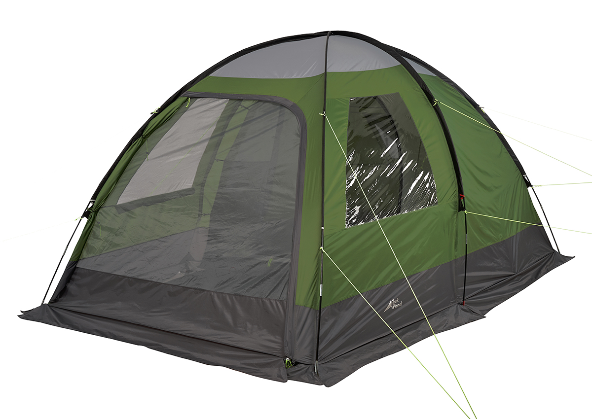 Высокая четырехместная кемпинговая палатка TREK PLANET Verona 4 прекрасно подойдет для продолжительного кемпинга. Палатка очень просторная благодаря своей высоте 200 см. Если убрать спальню, то палатку можно использовать как шатер, где с комфортом поместится большая компания со столом и стульями. В широком тамбуре расположены два больших прозрачных окна со шторками. Пришитый к внутренней палатке водонепроницаемый пол позволяет сохранить чистоту и уют в тамбуре. У палатки хорошая вентиляция благодаря москитной сетке на входе в тамбур в полный размер двери и трехпозиционному большому вентиляционному окну на задней стенке палатки. Конструкция из трех перекрещивающихся дуг обеспечивает максимальную ветроустойчивость. А материал внешнего тента с водостойкостью 4000 мм надежно защищает от дождя. По всему периметру палатки сделана юбка для защиты от ветра, дождя и насекомых.Для удобного хранения мелочей в палатке предусмотрены карманы как внутри спальни, так и снаружи. Чтобы сделать вечер уютным, можно подвесить фонарь на крючок под куполом.