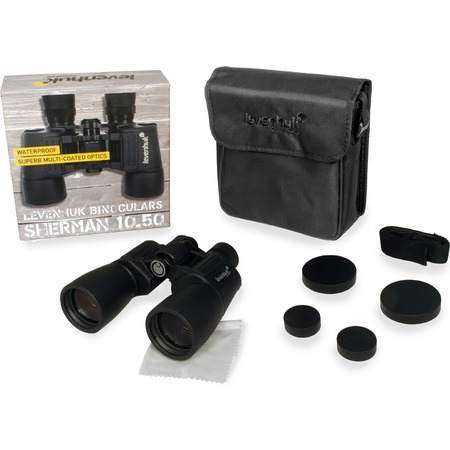 Кратность увеличения: 10x • Диаметр объектива: 50 мм • Диаметр выходного зрачка: 5 мм • Относительная яркость: 25 • Поле зрения (1000 м): 96 м • Реальный угол зрения: 5.5° • Минимальная дистанция фокусировки: 3 м • Тип бинокля: призменный бинокль (PORRO) • Межзрачковое расстояние: 70 - 80 мм • Вынесенная окулярная точка: есть, 20 мм • Диапазон диоптрийной коррекции: ±4DХарактеристики бинокля Levenhuk Sherman 10x50