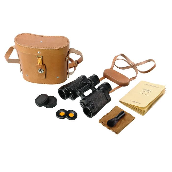 В комплекте поставки идет футляр из натуральной кожи. Он имеет жесткую конструкцию и надежно защищает бинокль от ударов и непогоды. Футляр снабжен плечевым ремнем и имеет пружинную застежку. Сам бинокль комплектуется шейным ремнем, на котором зафиксирована защитная крышка окуляров. Есть в комплекте и светофильтры. Их целесообразно использовать при ярком солнечном свете или для наблюдений в туманную погоду.