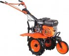 Мощный мотоблок с большой шириной захвата, укомплектован закаленными фрезами, что позволяет применять его на тяжелых грунтах и для обработки целины. Установлена ручка с возможностью регулировки и поворота в разных плоскостях. Переключение скоростей осуществляется через коробку передач, а понижение или повышение передачи можно производить перекидыванием ремня с одной проточки шкива на другую: 4 вперед, 2 назад. Особенностью этого мотоблока является специальный рычаг для фиксации сцепления, что очень удобно при использовании тележки. Наличие в комплекте пневматических колес позволяет использовать совместно с тележкой и есть возможность установки косилки. Отдельно можете приобрести и установить роторную косилку, шнекороторный снегоотбрасыватель, тележку, плуг, окучник, картофелевыкапыватель.