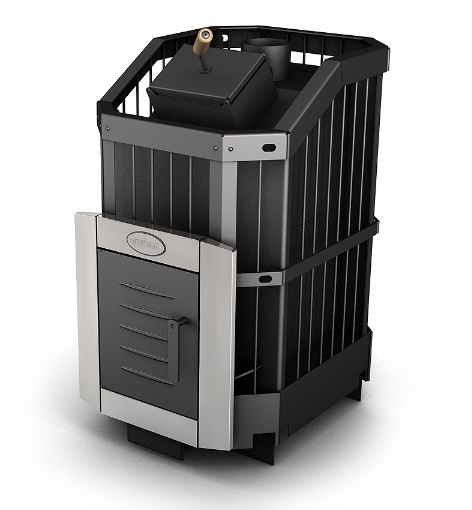 Емкая закрытая каменка оснащена дверцей с деревянной ручкой для защиты рук от ожогов
