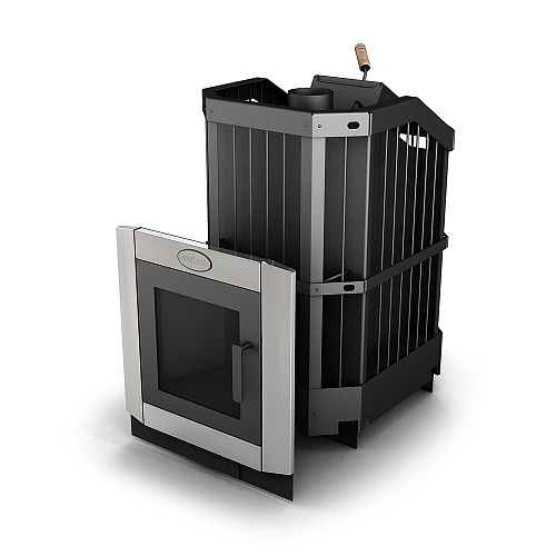 Емкая закрытая каменка оснащена дверцей с деревянной ручкой для защиты рук от ожогов