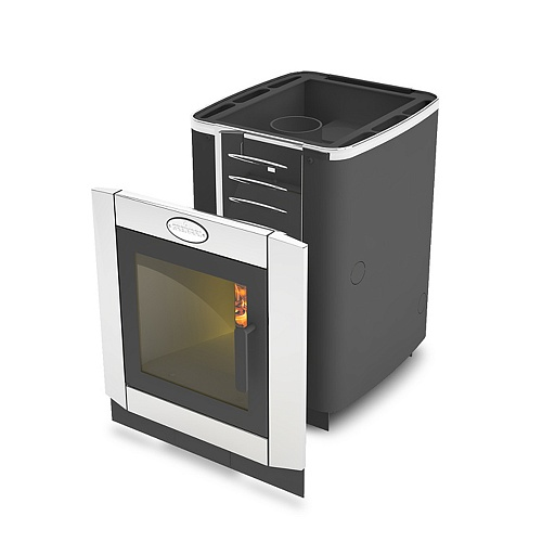 Вроде бы тоже размерами не блещет. Но это только на первый взгляд. Если присмотреться внимательнее, то поймешь, что печь таких небольших размеров — самая мощная в своем классе и совсем немного уступает «старшим» моделям. И дров много входит, да и каменка на 45 кг.