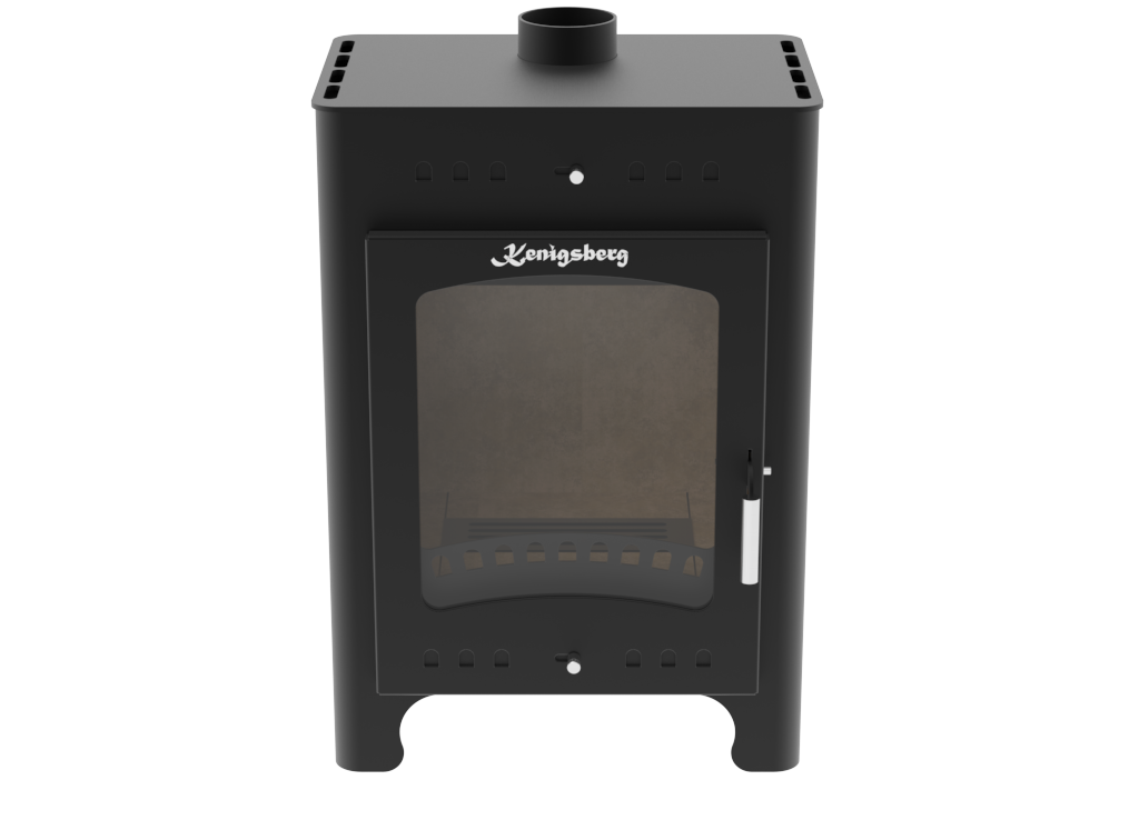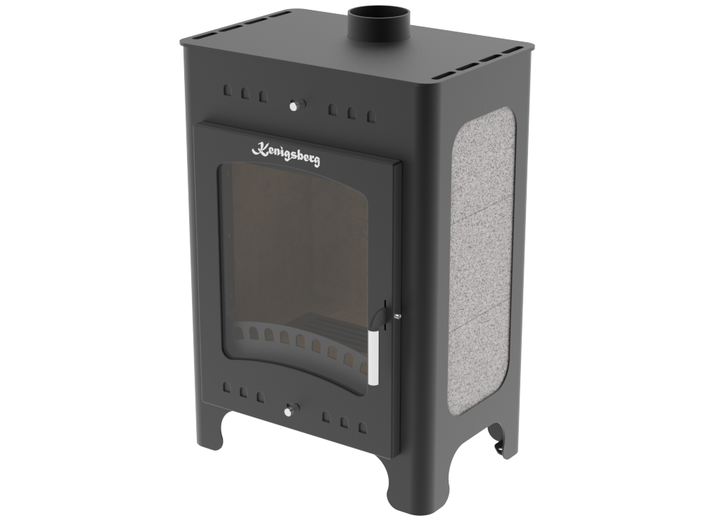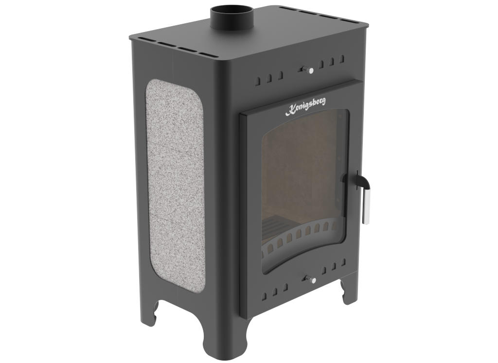 Kenigsberg 9U – дровяная печь современного дизайна, позволяющая отапливать жилое помещение (площадью до 70 кв.м) и дополнить интерьер привлекательным камином. Большое термостойкое стекло Робакс в дверце топки позволяет наблюдать за пламенем и быстро согреться под инфракрасными лучами. Боковые поверхности содержат вставки из керамической плитки, аккумулирующие тепло. Достоинством печи является удобная регулировка интенсивности горения при помощи двух заслонок, что дает возможность перевести печь в режим длительного горения. Модель отличается верхним расположением коллектора дымохода.