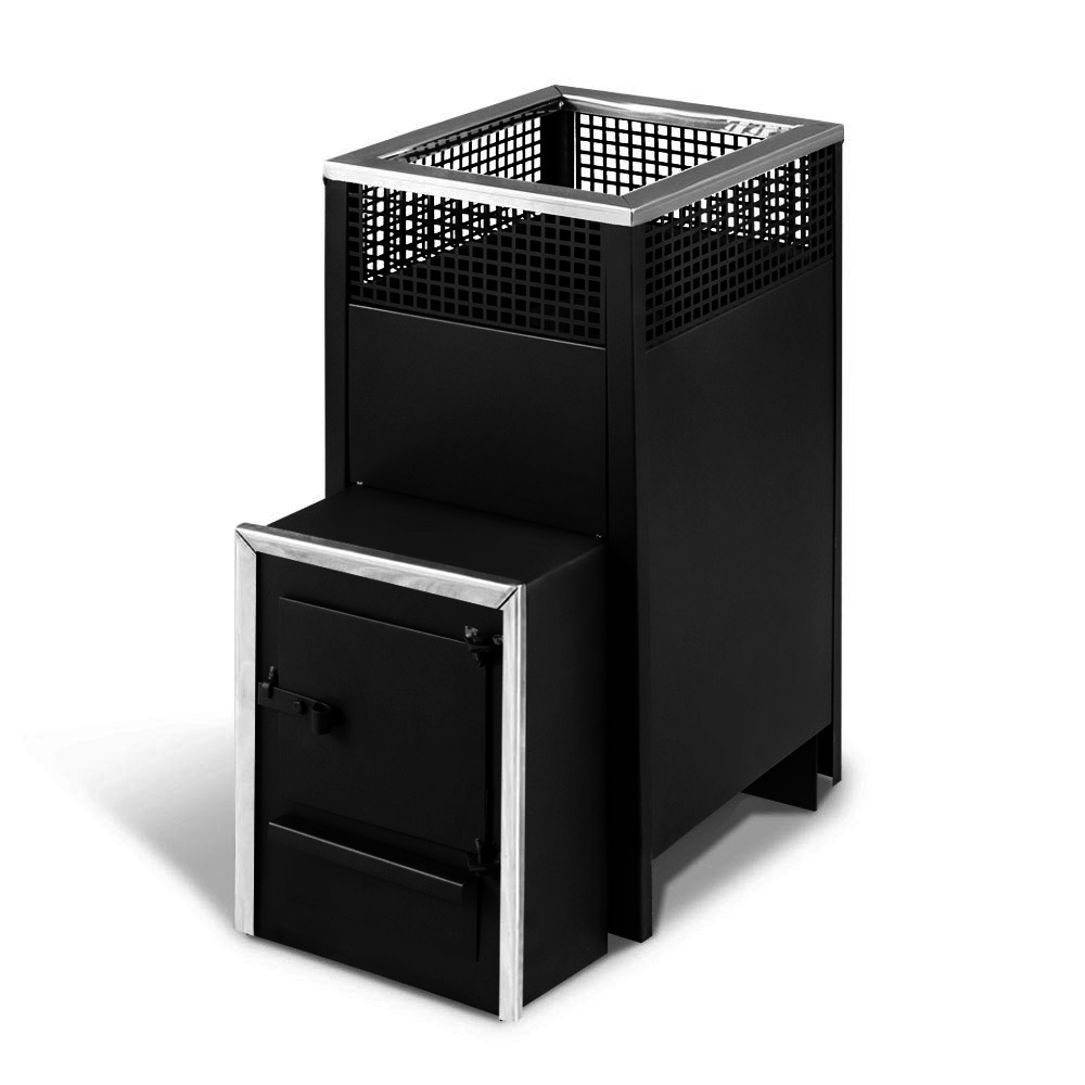 Малогабаритная печь с открытой каменкой для небольших парных. Благодаря своим размерам, исключительно подходит для бань типа «бочка». Горизонтальные дымовые каналы способствуют максимально быстрому и равномерному разогреву камней. Ускоренный нагрев воды достигается с помощью теплообменника, установленного на дымовой трубе. Между топкой и кожухом имеется зазор, в нем образуется конвекционный поток, способствующий циркуляции воздуха в парной, а также дополнительному теплу для нагрева камней. Верхняя часть выполнена из перфорированного листа с целью получения более рассеянного пара.