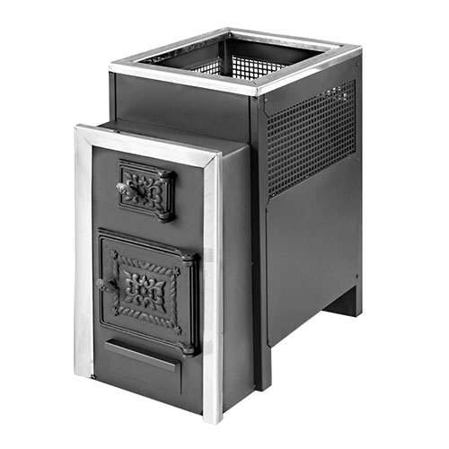 Печь газогенераторного типа с открытой каменкой и теплообменником для нагрева воды. В топке имеются отверстия для подачи воздуха в дымоход. Т.е., помимо получения тепла от сгорания твердого топлива, в печи происходит дожиг отработанных газов в дымоходе, что способствует повышению КПД и выгоранию сажи. При этом поверхность, на которую выкладываются камни, получает дополнительное тепло. Ребра, вваренные к топке и дымоходу, увеличивают теплоотдачу и являются дополнительными усилителями, принимающими давление дымоходной трубы. Защитный кожух обеспечивает отвод тепла, циркуляцию воздуха в парной