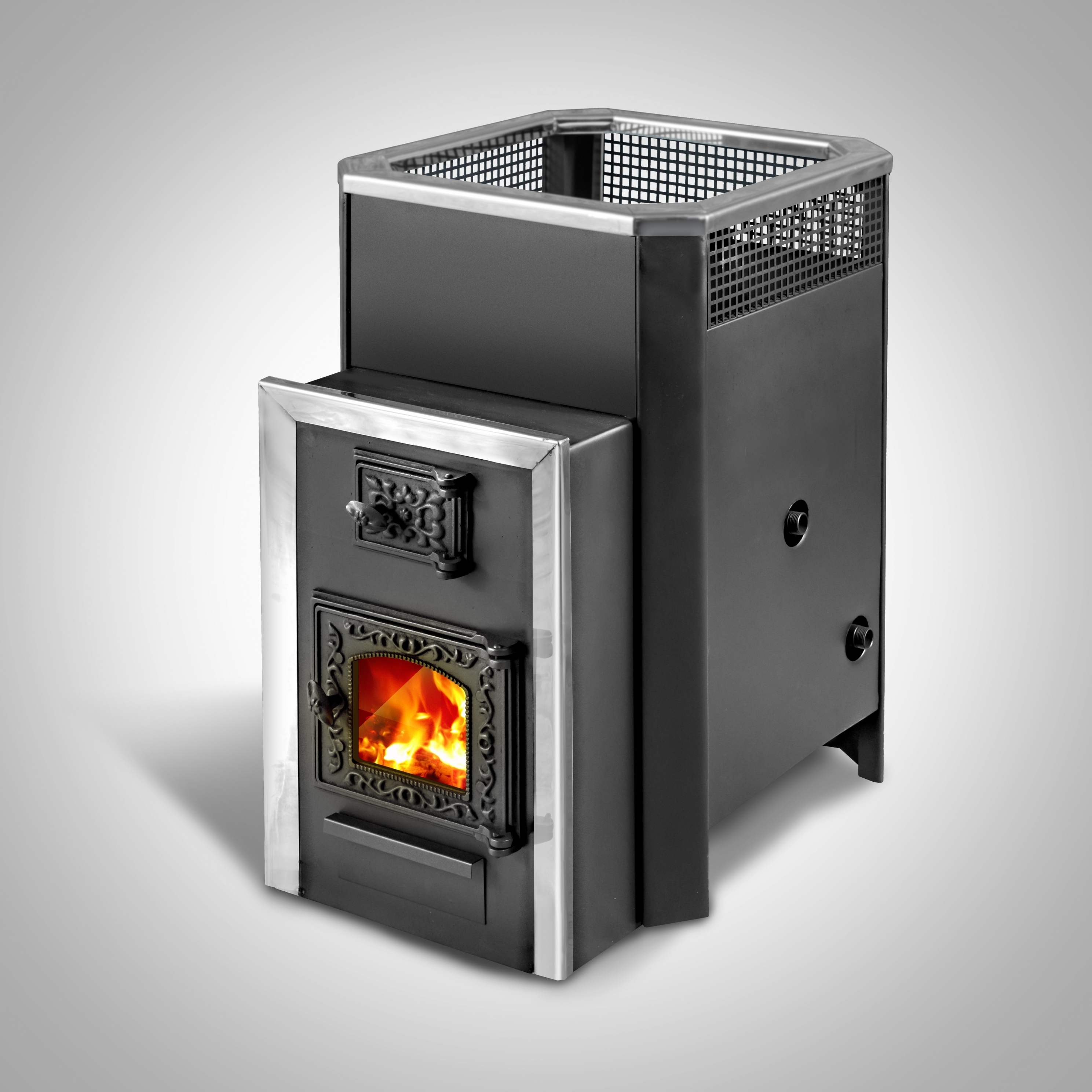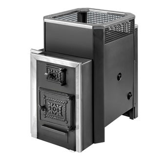 Печь с открытой каменкой и встроенным теплообменником. Длина дымовых каналов, а также площадь теплоотдачи существенно больше, чем у остальных моделей. Жар равномерно распределяется по всем плоскостям каменки. Увеличенные дымовые каналы печи граничат не только с камерой каменки, но и с конвекционным каналом. Горячие газы в дымоходе максимально отдают тепло, увеличивая КПД печи. Удачна в этой модели геометрия каменки. Избыток влаги концентрируется в центре, исключая попадание воды на топку, пол. Жар распространяется равномерно по всей площади камеры с камнями. Подключение к встроенному теплообменнику для нагрева воды возможно с одной из трех сторон. Защитный кожух является конвекционным туннелем. В верхней части кожуха по периметру каменки установлен перфорированный лист. Проходя сквозь решетку, пар становится рассеянным, распространяется более равномерно по всем направлениям.