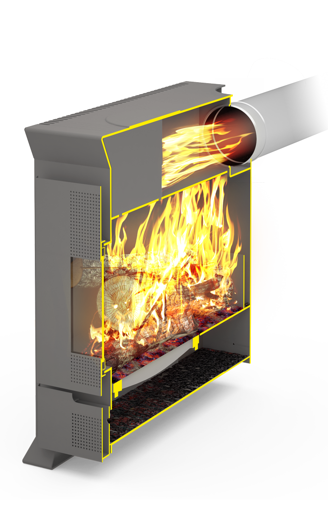 • Двухканальная система дожигателей, обеспечивающая поддержание горения одной закладки дров до 8 часов.
