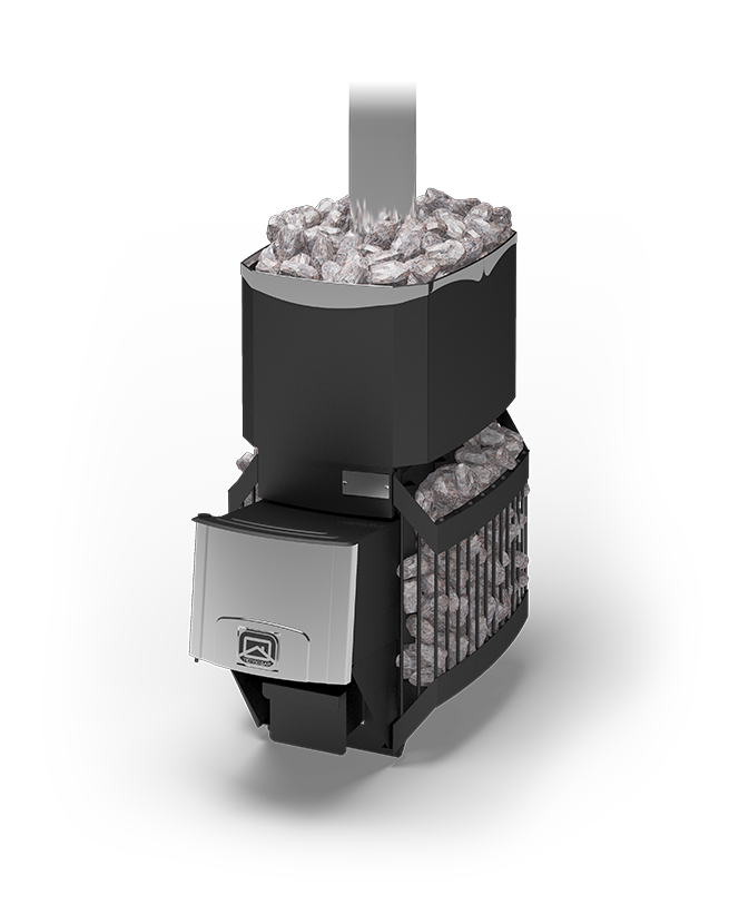 Конструкция печи-каменки представляет собой вертикальную топку сделанную из жаростойкой нержавеющей стали с содержанием хрома не менее 13 % закрытую сеткой с боков и кожух-конвектором спереди и сзади, обеспечивающие высокую динамику нагрева парильного помещения.