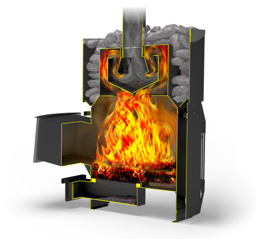 Кожух-конвектор экранирует жесткое инфракрасное излучение, исходящее от раскаленных стенок топки, что создает «мягкое» тепло в парилке.