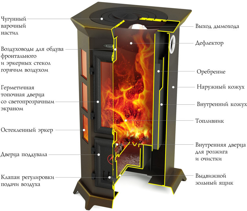 Как правило, печь представляет собой устройство с закрытой топкой. Ее основное предназначение — обогрев помещения. Кроме того, печь может быть оборудована варочной панелью, что делает устройство пригодным для приготовления и разогрева пищи.