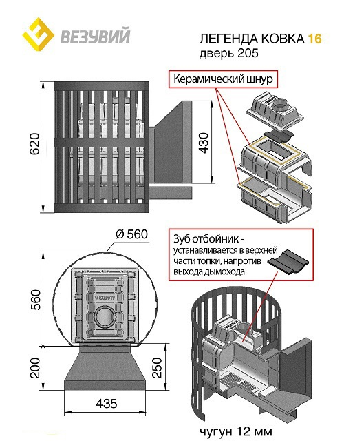 Банная чугунная печь Легенда люкс 16 камин (205) укомплектована чугунной герметичной, самоохлаждаемой дверцей Везувий 205 с жаропрочным стеклом «SHOT ROBAX», с оборудованной системой самоочистки, и конвекционно-вентилируемый кожухом "ЛЮКС". В конструкции данной печи предусмотрен топочный тоннель длиной 250 мм, при помощи которого печь топится из соседнего помещения, смежного с парильным.