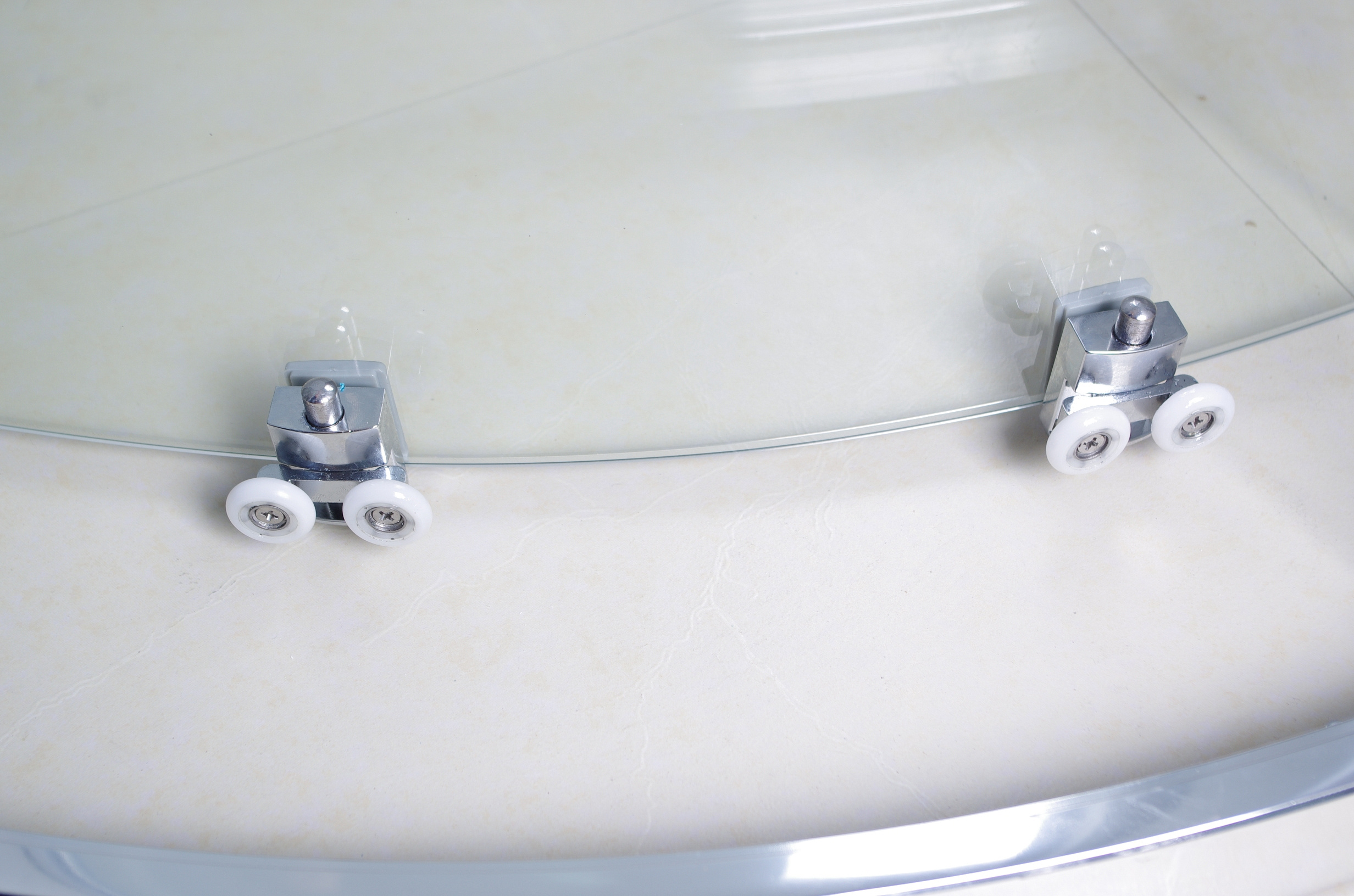 Профиль: анодированный, алюминиевый, хромированный, глянцевый. На профиле магнитный уплотнитель. Стекло: 6 мм, закаленное, ударопрочное. Металлические, двойные, бесшумные ролики. Металлические ручки. Быстрая технология сборки без силикона: соединение профилей замочного типа, без саморезов.