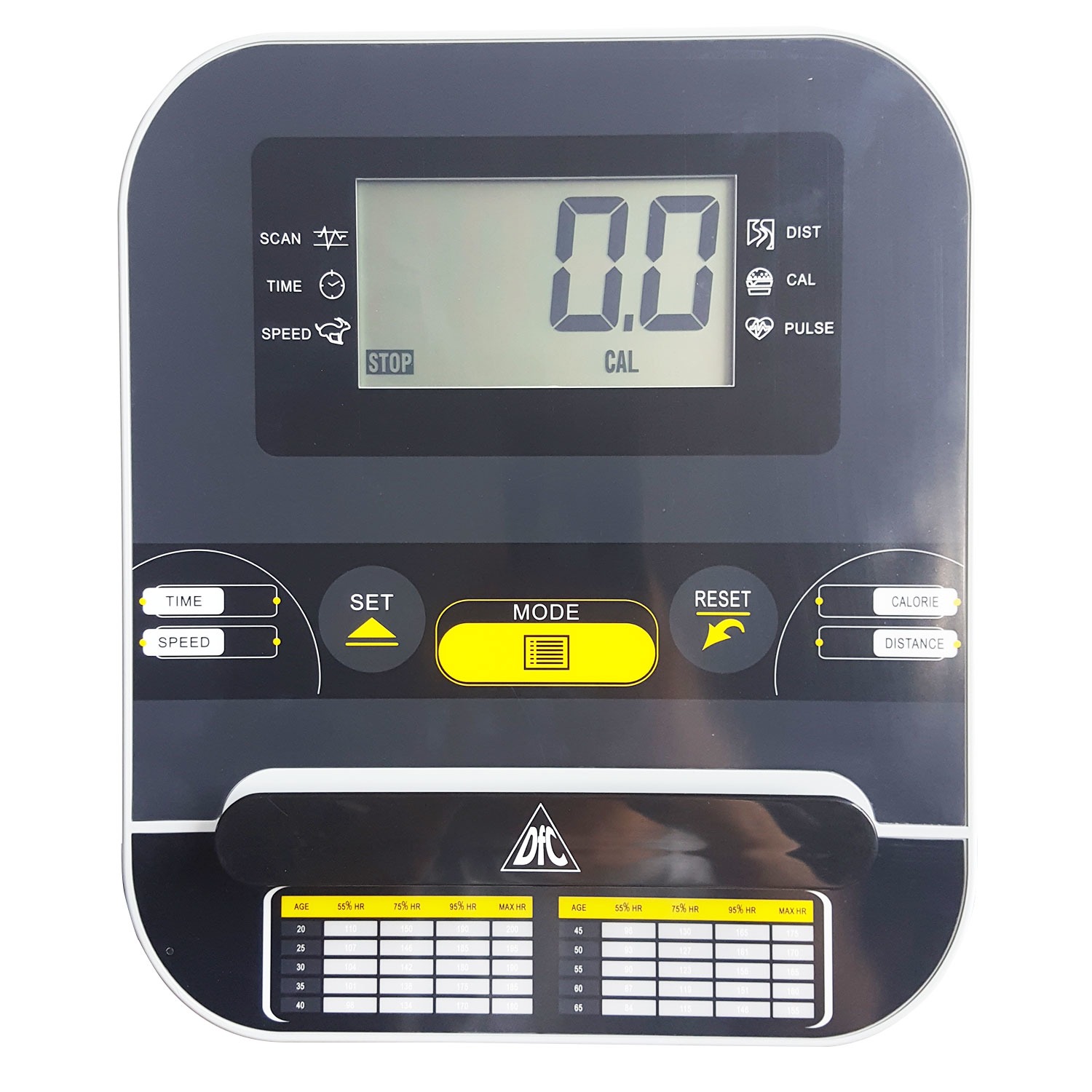 Большой LCD-дисплей отображает всю необходимую во время тренировку информацию. Держатель для планшета или смартфона позволит не заскучать во время занятий. Датчики пульса расположены на руле.