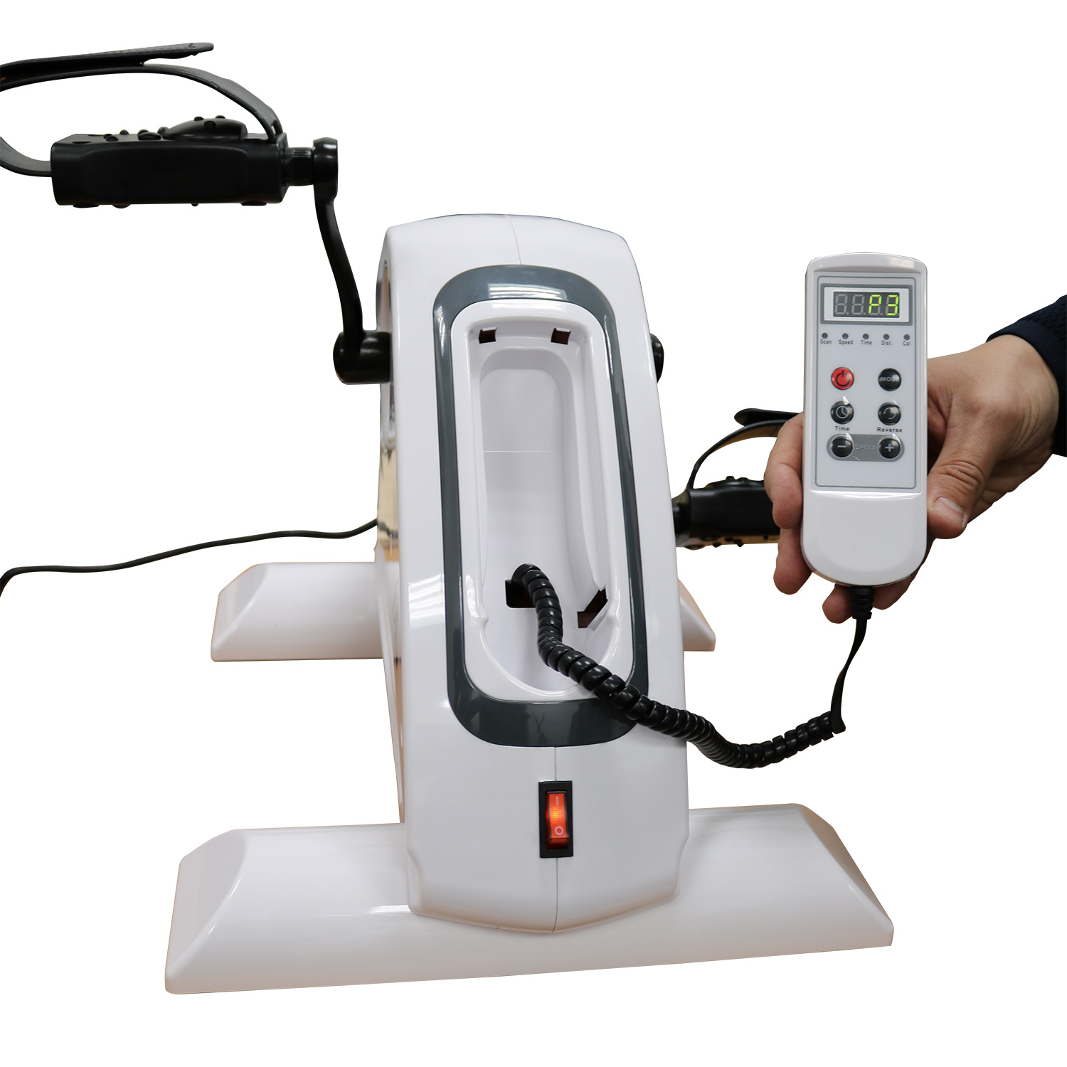 Широкие педали с регулируемыми ремешками крутятся за счет электродвигателя и заставляют двигаться руки и ноги с разной нагрузкой.