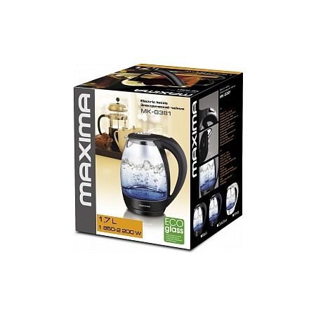 Тип: чайник • Объем: 1.7 л • Мощность: 2200 Вт • Материал корпуса: пластик, стекло • Цвет: белый, синий, черный • Нагревательный элемент: скрытый • Фильтр: есть • Указатель уровня воды: есть • Индикация включения: есть • Автоотключение при закипании: есть • Блокировка включения без воды: есть • Вращение на 360 градусов: есть • Отсек для хранения шнура: есть • Длина шнура питания: 70 смХарактеристики чайника Maxima MK-G381