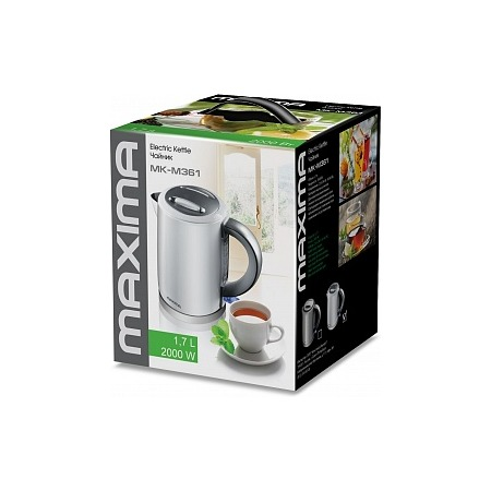 Тип: чайник • Объем: 1.7 л • Мощность: 2000 Вт • Материал корпуса: нерж. сталь • Цвет: нерж. сталь • Нагревательный элемент: скрытый, покрытие - нержавеющая сталь • Указатель уровня воды: есть • Индикация включения: есть • Автоотключение при закипании: есть • Блокировка включения без воды: есть • Вращение на 360 градусов: естьХарактеристики чайника Maxima MK-M361