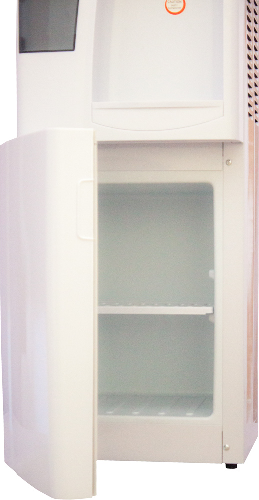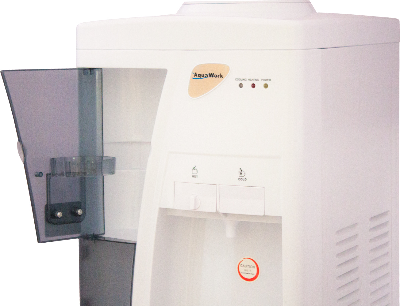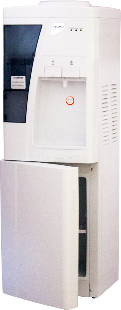 Напольный кулер для воды Aqua Work 3-W с электронной системой охлаждения, встроенным шкафчиком и стаканодержателем.