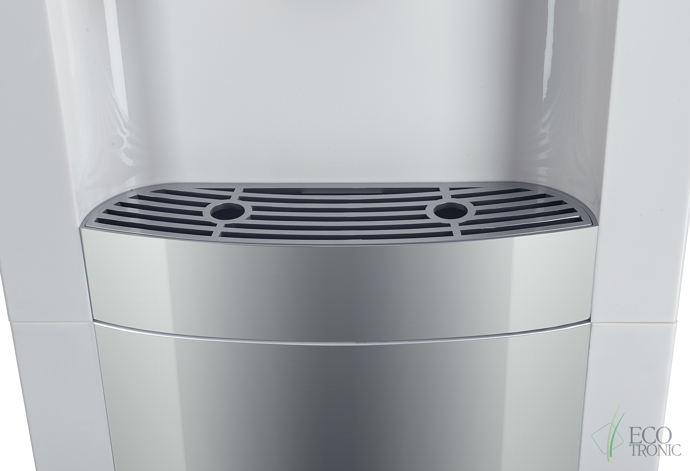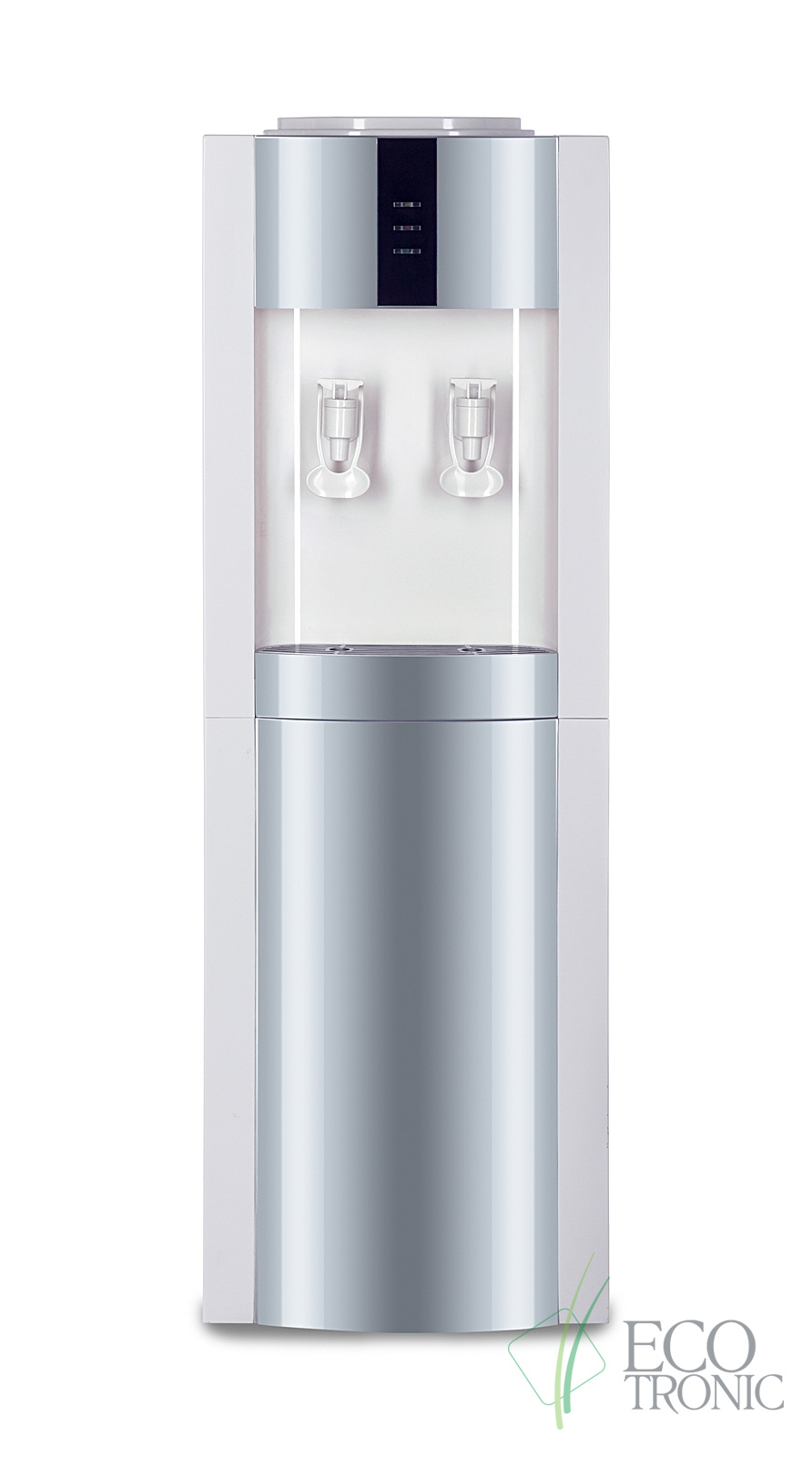 Бюджетный вариант напольного раздатчика воды, без нагрева и охлаждения. Цвет белый с серебристой вставкой. Тип кранов подачи воды - "Нажим кружкой".