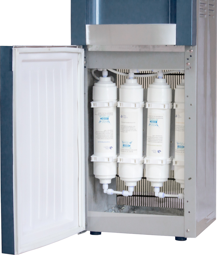 Пурифайер не нуждается в установке 19-литровых бутылей. Он подключается к городской системе водопровода и питается водой, пропущенной через систему сменных фильтров.