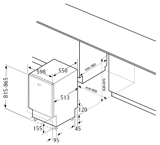 К группе узких напольных посудомоек относятся модели с шириной 45-50 см, но со стандартной высотой (ок. 85 см). Загрузка таких машин обычно не превышает девяти комплектов посуды.
