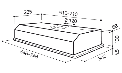 Встраиваемые вытяжки, как правило, работают в проточном режиме и требуют проводки воздуховода. Их главный плюс заключается том, что их можно почти полностью спрятать под столешницей или в кухонном шкафчике (см. "Тип встраивания"). Пользователю фактически остается видна только заборная часть вытяжки (то есть та, которая непосредственно поглощает воздух).