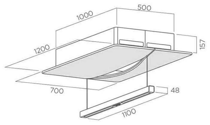 Подвесные вытяжки имеют рабочую площадь, равную варочной поверхности, над которой располагаются, и небольшую высоту, благодаря чему их иногда еще называют плоскими подвесными. Устанавливаются они под кухонным шкафчиком. Необходимо учесть высоту самого шкафа, чтобы нижняя часть корпуса вытяжки и соседних шкафчиков находились примерно на одной линии. Такие модели чаще всего относятся к бюджетному классу вытяжек.