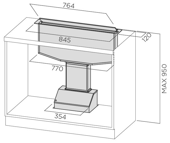 Подвесные вытяжки имеют рабочую площадь, равную варочной поверхности, над которой располагаются, и небольшую высоту, благодаря чему их иногда еще называют плоскими подвесными. Устанавливаются они под кухонным шкафчиком. Необходимо учесть высоту самого шкафа, чтобы нижняя часть корпуса вытяжки и соседних шкафчиков находились примерно на одной линии. Такие модели чаще всего относятся к бюджетному классу вытяжек.
