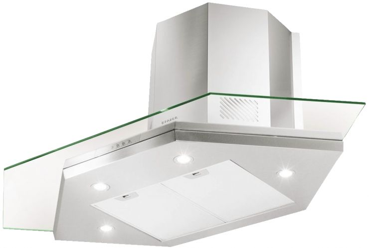 Современная вытяжка, в которой удачно сочетаются сталь и закаленное стекло, идеально вписывается в угловое пространство кухни. Галогенные лампы расположены по периметру вытяжки и полностью освещают варочную поверхность.
