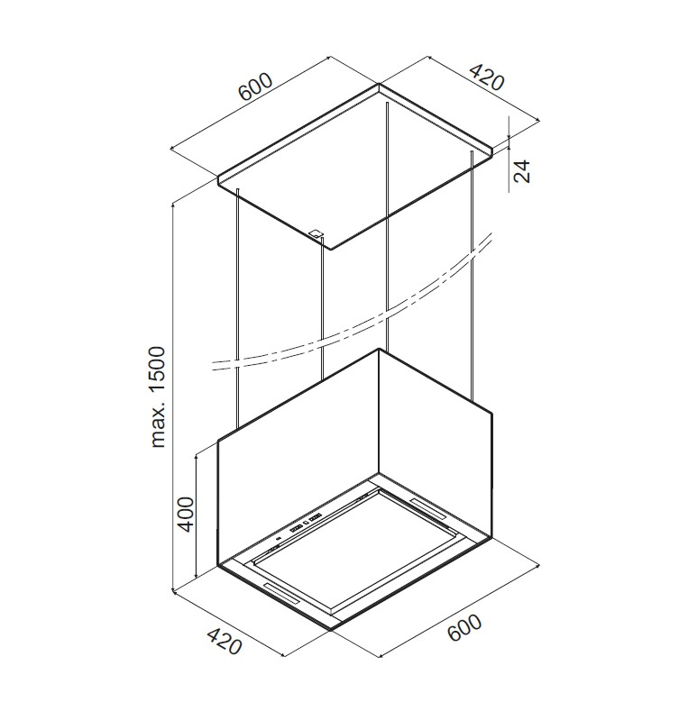 Островная вытяжка монтируется к потолку над поверхностью плиты. На ваш выбор можно сделать отвод в вентиляционное отверстие или использовать сменный угольный фильтр.