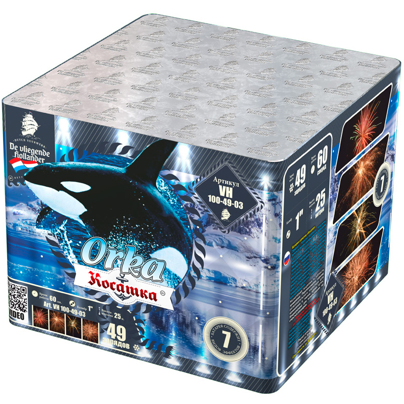 Фейерверк "Косатка" - это удивительный водоворот пиротехнических задумок. Эффекты 49-залпового фейерверка поразят и увлекут абсолютно любого зрителя. Раскрытие каждого залпа - словно фонтан брызг, поднятых в воздух резвящейся в морской воде косаткой. В салюте собраны самые популярные и красивые эффекты марки "Летучий Голландец". Например, в начале шоу вы увидите распустившийся в дымке цветок с лепестками красного и зеленого цветов, а также золотистыми стеблями. Далее появляются цветы сине-оранжевого цвета и оранжевого цвета. Постепенно к цветам добавляются и другие эффекты, например, золотые форсы, мерцание. В завершающем акте - облака из трещащих искр.