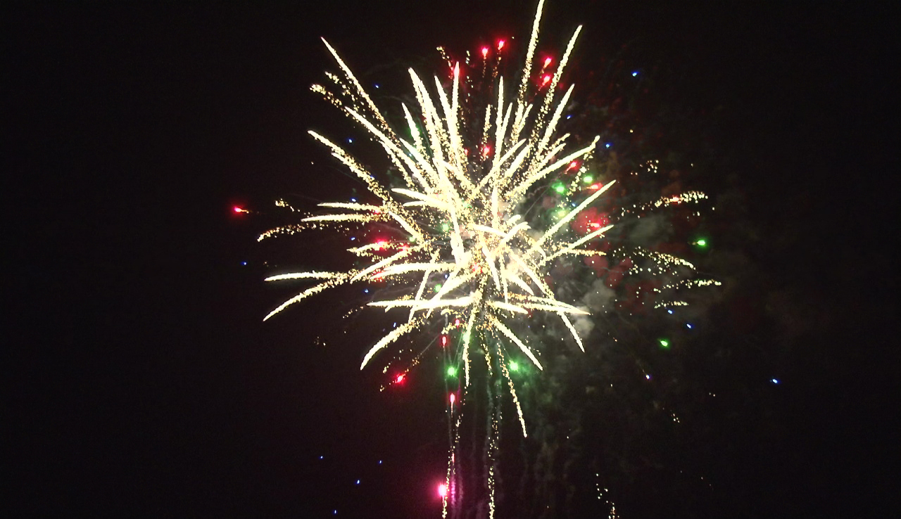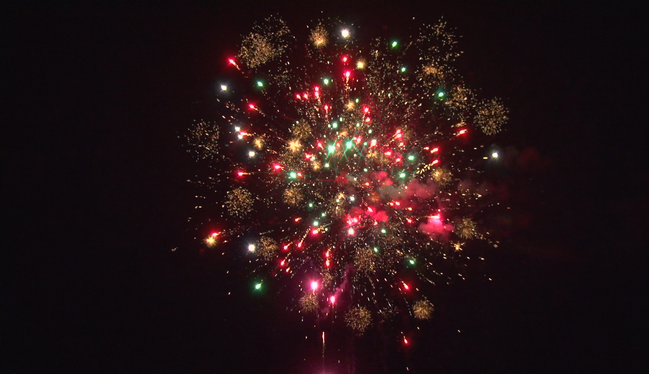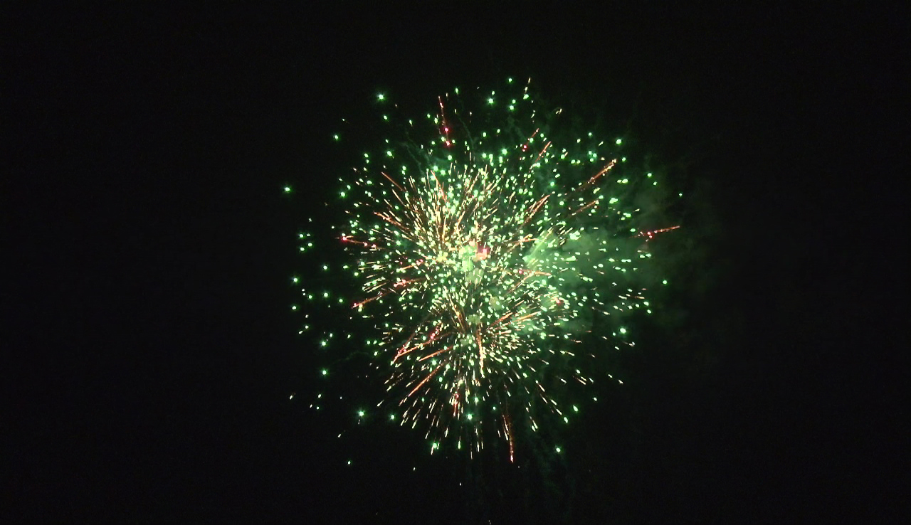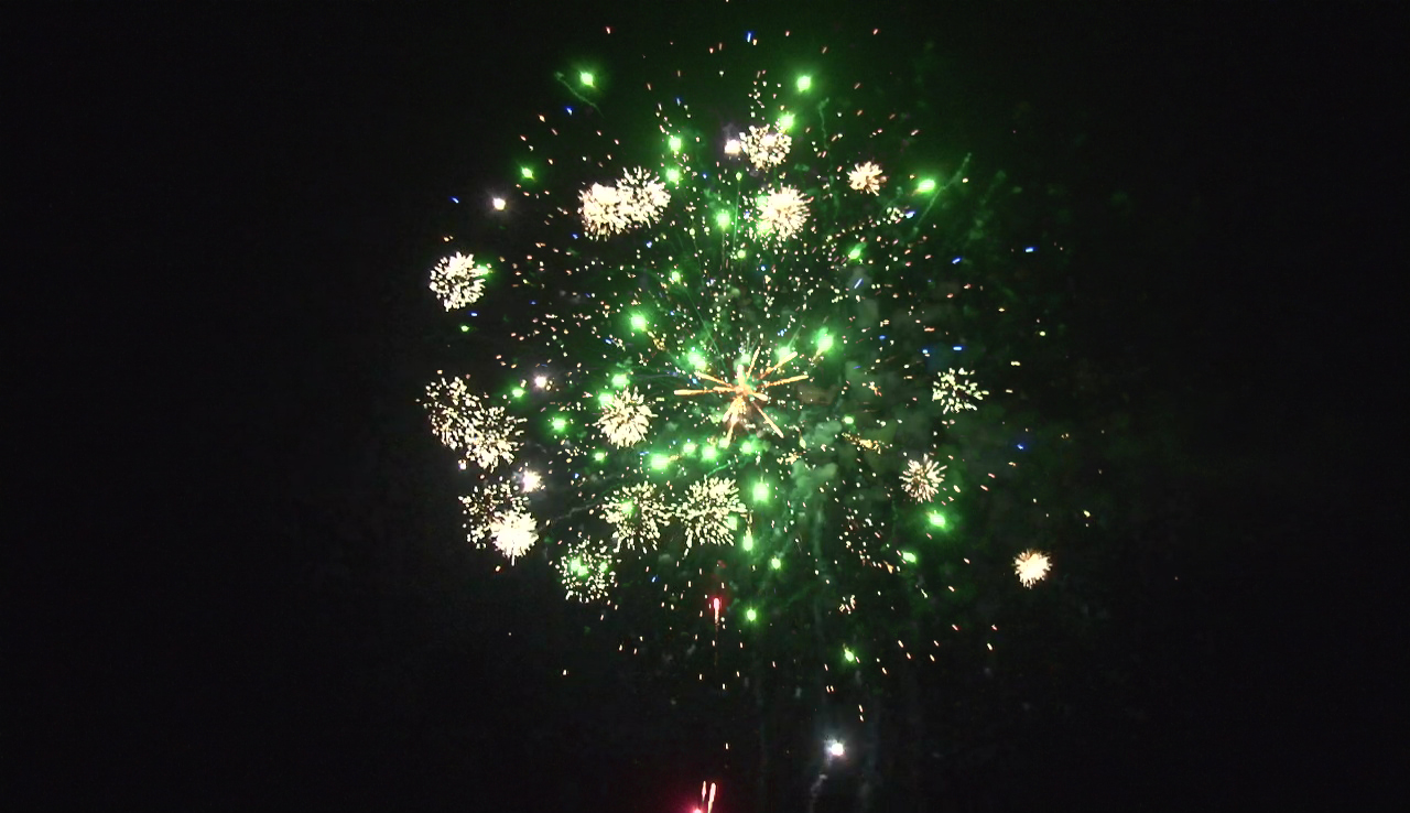 - Зеленые мерцающие огни и золотые форсы с красными искрами.