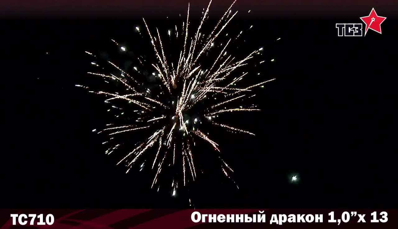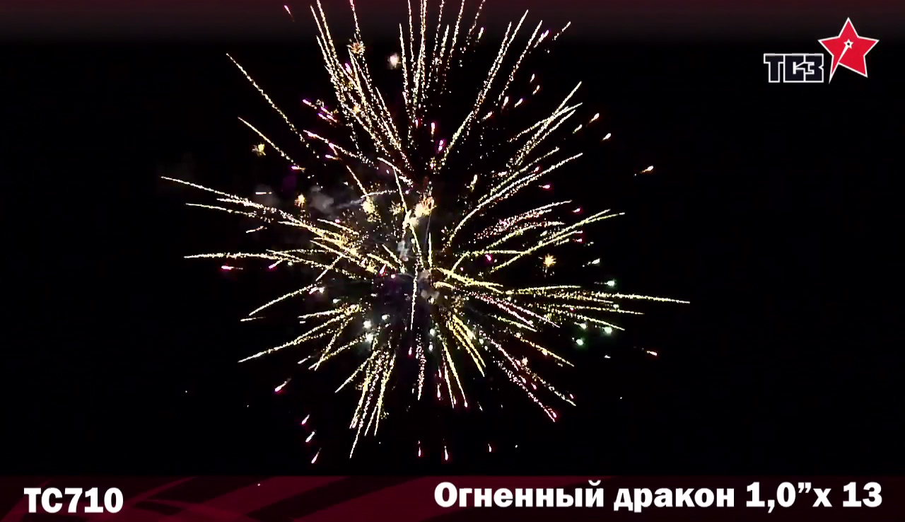 В этом фейерверке мощные разноцветные кометы взрываются сферами искрящихся золотых форсов и мерцающим серебром огненных ручьев! Этот 13-ти залповый малыш низвергает фиолетовые и золотые искры, словно настоящий огнедышащий дракон! Но не стоит его пугаться - он ручной и, закончив свое представление, мирно исчезает в темноте ночи, оставив после себя легкий треск и исчезающие в небе золотые искорки.
