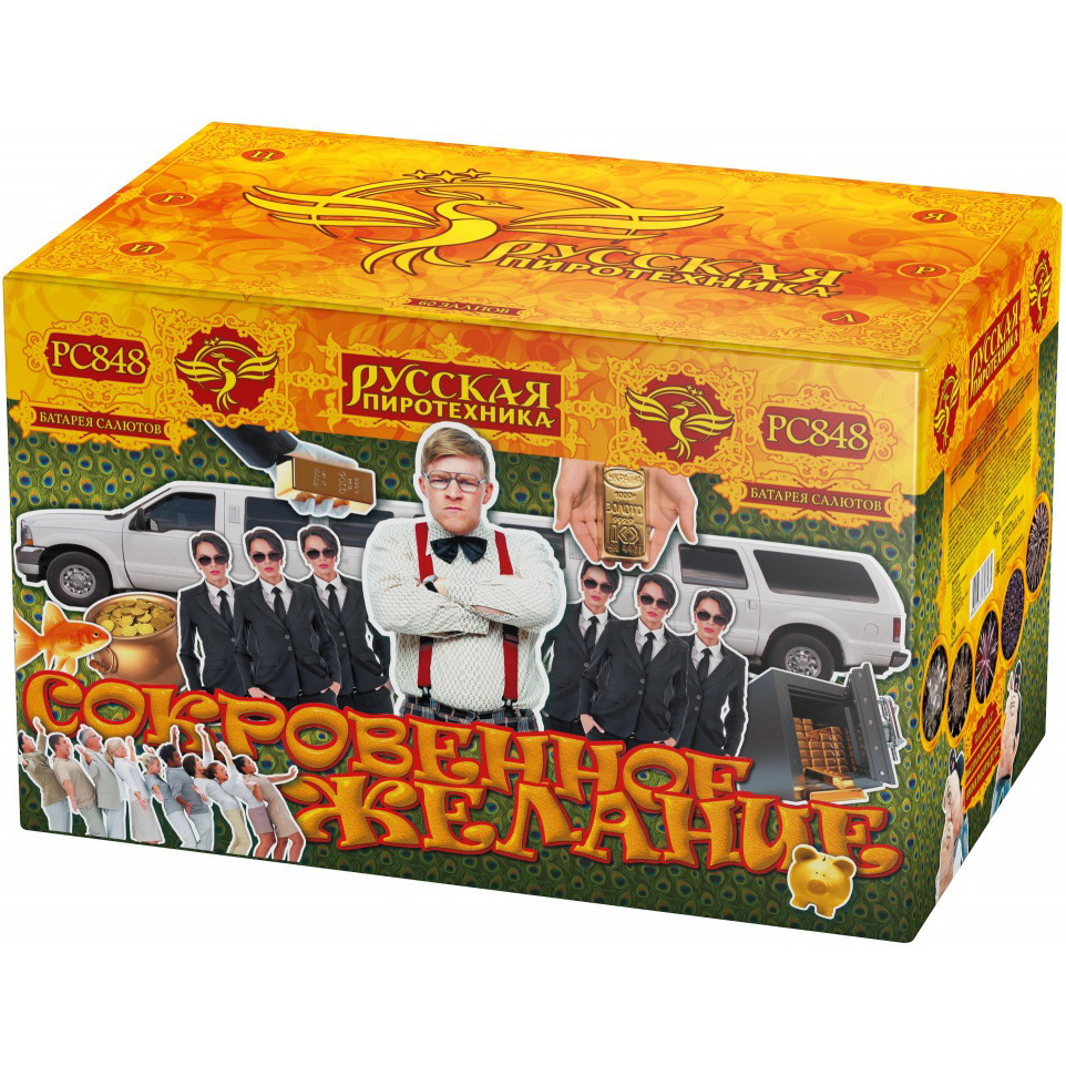 Создатели фейерверков - люди с юмором, поэтому кроме "торжественных", "романтичных" и "молодежных" салютов встречаются и такие, как фейерверк "Сокровенное желание". В карикатурной форме изображен Новый Русский с полным набором аттрибутов: лимузины, охрана, золотые слитки и толпа жадных, завистливых прихлебателей :) Такая коробка порадует вашего друга-бизнесмена, конечно, если у него тоже есть чувство юмора... Эффекты, как всегда у "Русской пиротехники", великолепны: крупные, яркие звезды-жемчужины красного, белого, синего и зеленого цветов формируют большие сферы - "зонтики"; их сопровождают трещащие форсы, разбрасывающие яркие золотые и серебряные искры, мерцающие огоньки и сферы из золотых трещащих искр.