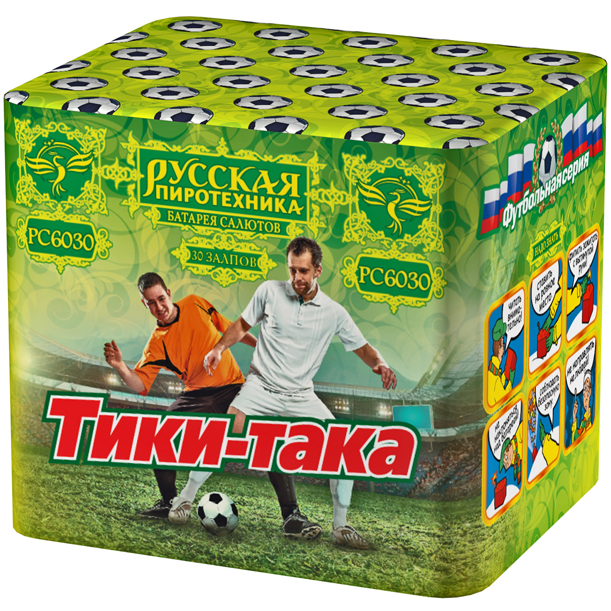 Салют "Русской Пиротехники" из "футбольной серии", приуроченной к Чемпионату мира по футболу 2018 в России - "Тики Така". Запустите этот фейерверк - это будет стать лучшим способом поздравить любимую команду с победой! Звонкий и громкий, он забивает целых 30 безответных мячей в небесные ворота!