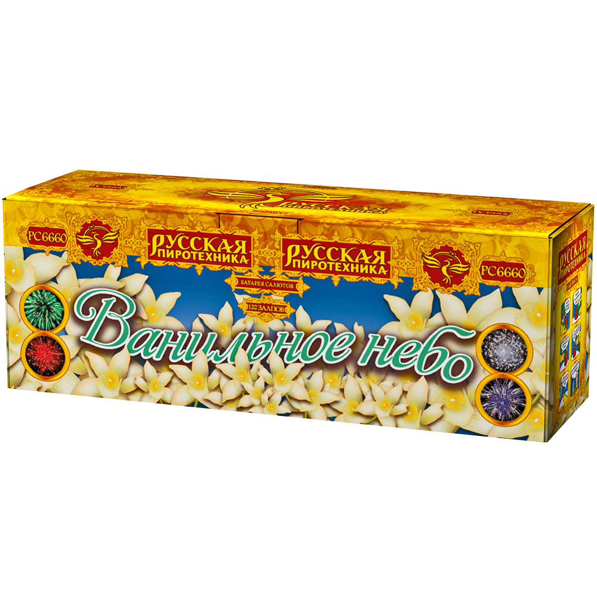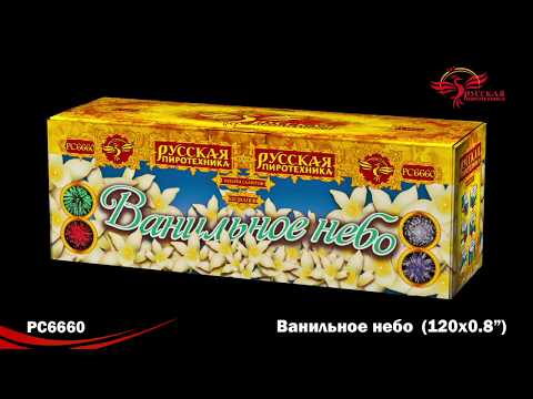 Салют "Ванильное небо" от "Русской пиротехники" - одна из самых заметных новинок пиротехнической осени 2013 года. В красивой коробке удлиненной формы, украшенной цветками ванили, спрятаны 9 замечательных эффектов. Профессионалы из "Русской Пиротехнки" постарались, и вложили в этот фейерверк всю свою душу и талант: яркие пионы синего, красного и зеленого цвета; белоснежные и зеленые мерцающие облака; золотые мерцающие форсы; сиренево-фиолетовые сферы с серебряными искрами; зеленые звезды с серебристыми форсами; множество трещащих залпов и огней. Этот фейерверк непременно станет одним из хитов новогодней ночи 2013-2014!