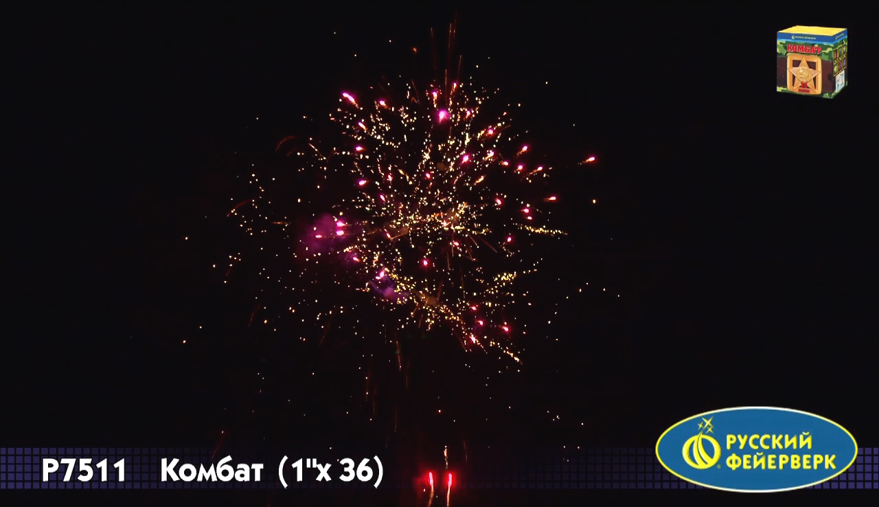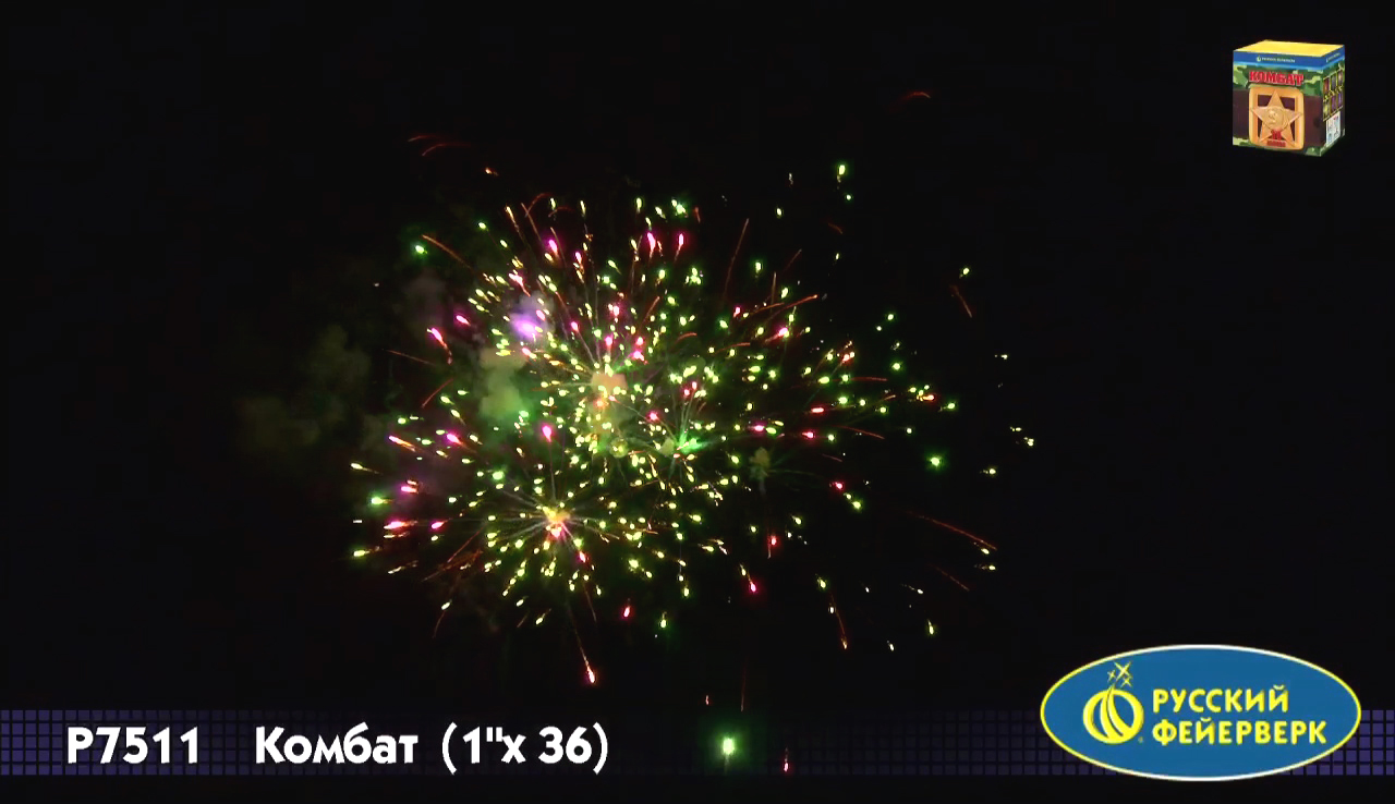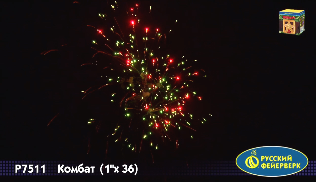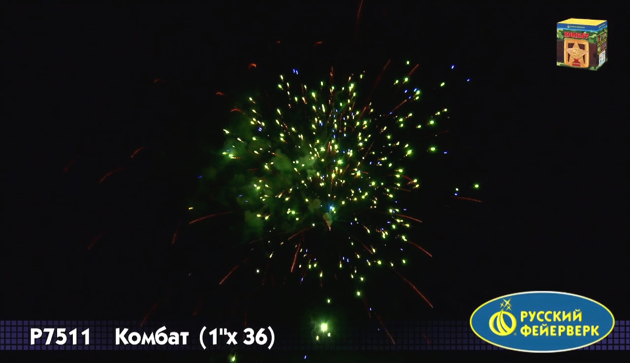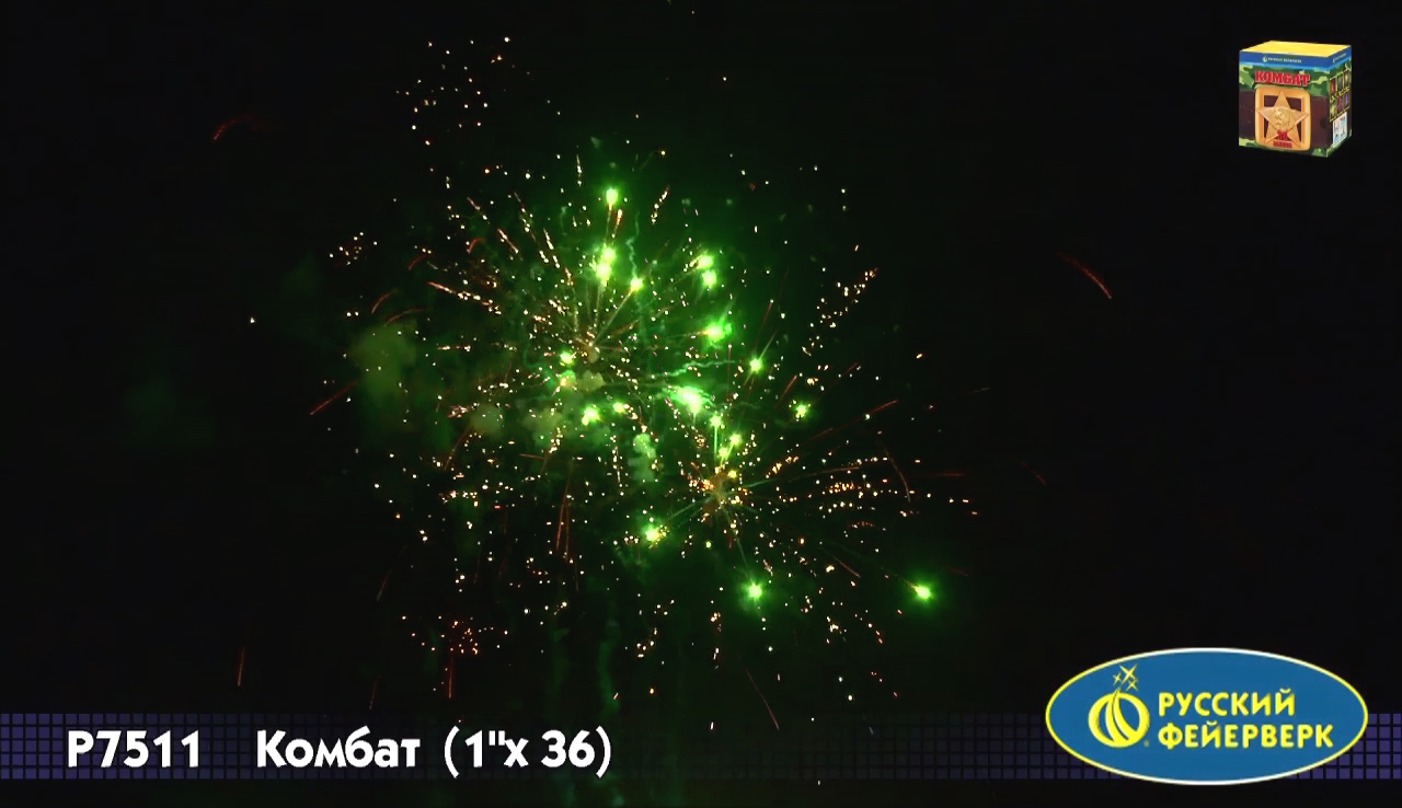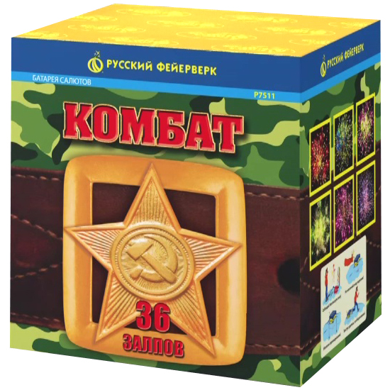 Фейерверк "Комбат", упакованный в коробку цвета хаки, лучше всего подойдет для "мужских" праздников - 23 февраля, 9 мая, день ВДВ и т.д. Его эффект - тридцать шесть ярких сфер: красные звезды, золотые хвосты, облака трещащих разрывов, белое мерцание, белохвостые и золотые кометы... Обратите внимание, что с 2015 года салют полностью поменялся (36 залпов вместо 19 залпов и другие эффекты).
