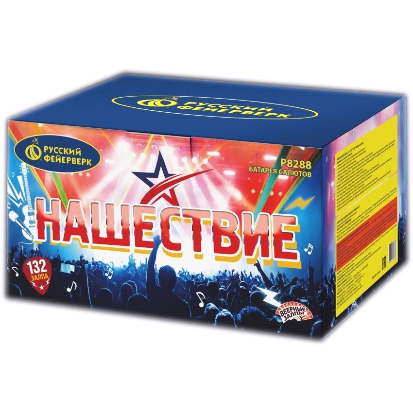 Это представление - настоящая пиротехническая бомба! "Нашествие" - супер-фейерверк с огромным количеством залпов и максимально разнообразными эффектами, а благодаря комбинации двух калибров цена такого изделия ниже. Великолепно подобранная цветовая гамма салюта, громкие взрывы калибра 1,25" делают этот салют грандиозным, поэтому неудивительно, что его назвали в честь легендарного российского рок-фестиваля! 132 залпа включили столько эффектов, что проще указать, чего в нем нет - нашлось место и для пышных пионов, и для впечатляющих хризантем, и для мерцания, и для трещащих звезд, и для парчи. Фейерверк "Нашествие" - это многообещающее начало и незабываемое, дерзкое, впечатляющее завершение! Оцените и вы всю силу и мощь этого представления, энергичного, как хитовая композиция популярной рок-группы!