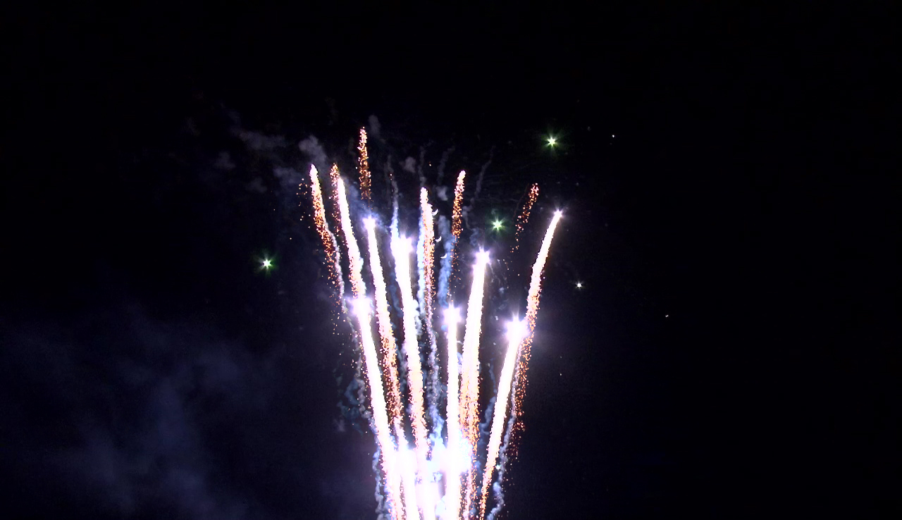 - Красочная концовка: Вертушка разрывается сине-фиолетовой сферой (пион) и облаком золотых трещащих разрывов (трещащая хризантема).
